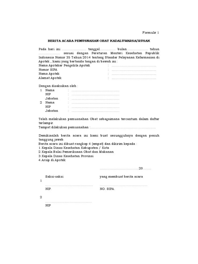 Berita acara pemusnahan obat kadaluarsa. Pemusnahan obat selain narkotika dan psikotropika dilakukan oleh apoteker dan disaksikan oleh tenaga kefarmasian lain yang memiliki surat izin praktik atau surat izin kerja. April 05 2017 tidak ada komentar pemerintah kabupaten luwu timur.