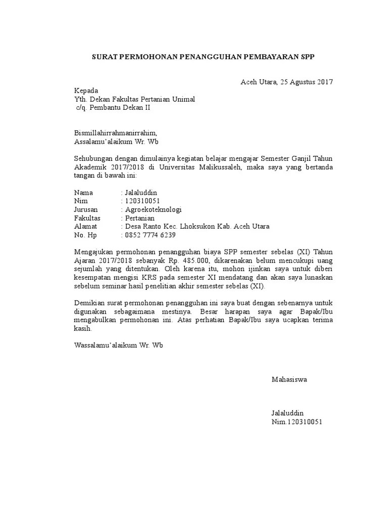 Contoh Surat Permohonan Dispensasi Pembayaran Spp - Surat dispensasi spp 6 contoh surat permohonan dispensasi yang resmi baik dan 15 kumpulan contoh surat permohonan dana izin bantuan. Di bawah ini adalah contoh surat dispensasi kuliah untuk keterlambatan pembayaran spp yang biasa dipergunakan. Adapun surat permohonan dispensasi ini saya ajukan dengan pertimbangan dan alasan orang tua saya yang baru saja kecelakaan dan harus menjalani operasi di rumah sakit adam. Demikian surat pernyataan ini saya buat dengan sebenar benarnya dan besar harapan saya bapak ibu dapat memberikan kebijakan kepada saya terkait dispensasi pembayaran spp semester ii dua.